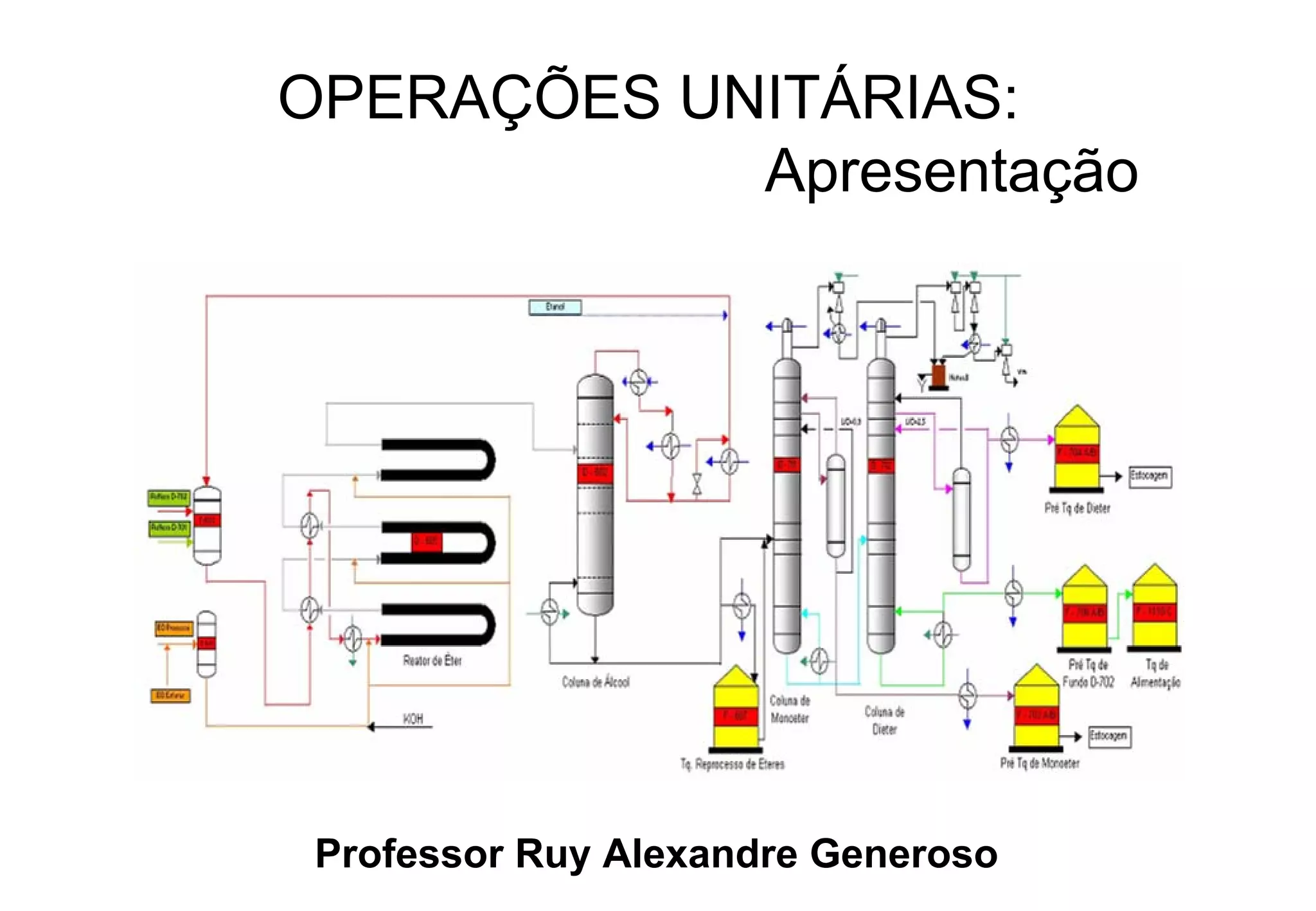 O documento apresenta conceitos sobre operações unitárias, definindo-as como etapas sequenciais em processos industriais que envolvem transferência de calor, massa ou operações mecânicas. Explica os principais tipos de operações unitárias como bombas, trocadores de calor, destiladores e filtros e suas aplicações na indústria química e de processos.