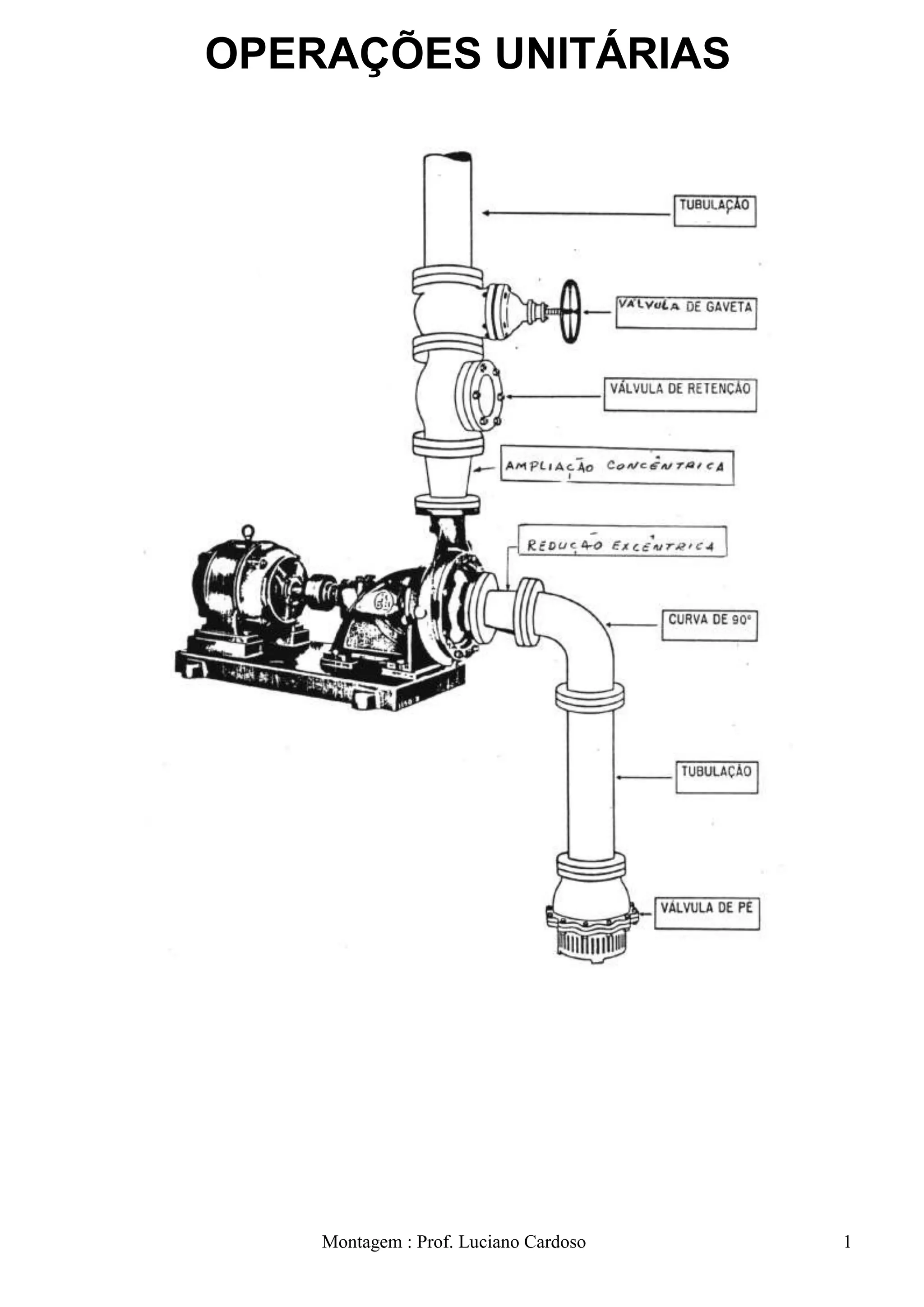 O documento apresenta um resumo dos principais tópicos abordados no curso de Operações Unitárias, dividido em seis partes: 1) Introdução, conceitos gerais; 2) Elementos de Mecânica dos Fluidos; 3) Bombas Hidráulicas; 4) Caldeiras; 5) Trocadores de Calor; 6) Destilação. A primeira parte introduz os conceitos-chave da disciplina. A segunda parte aborda noções de hidrostática e hidrodinâmica.