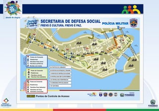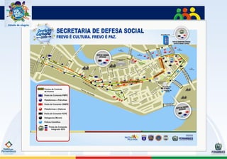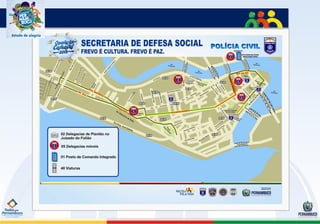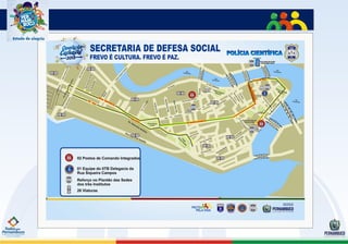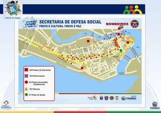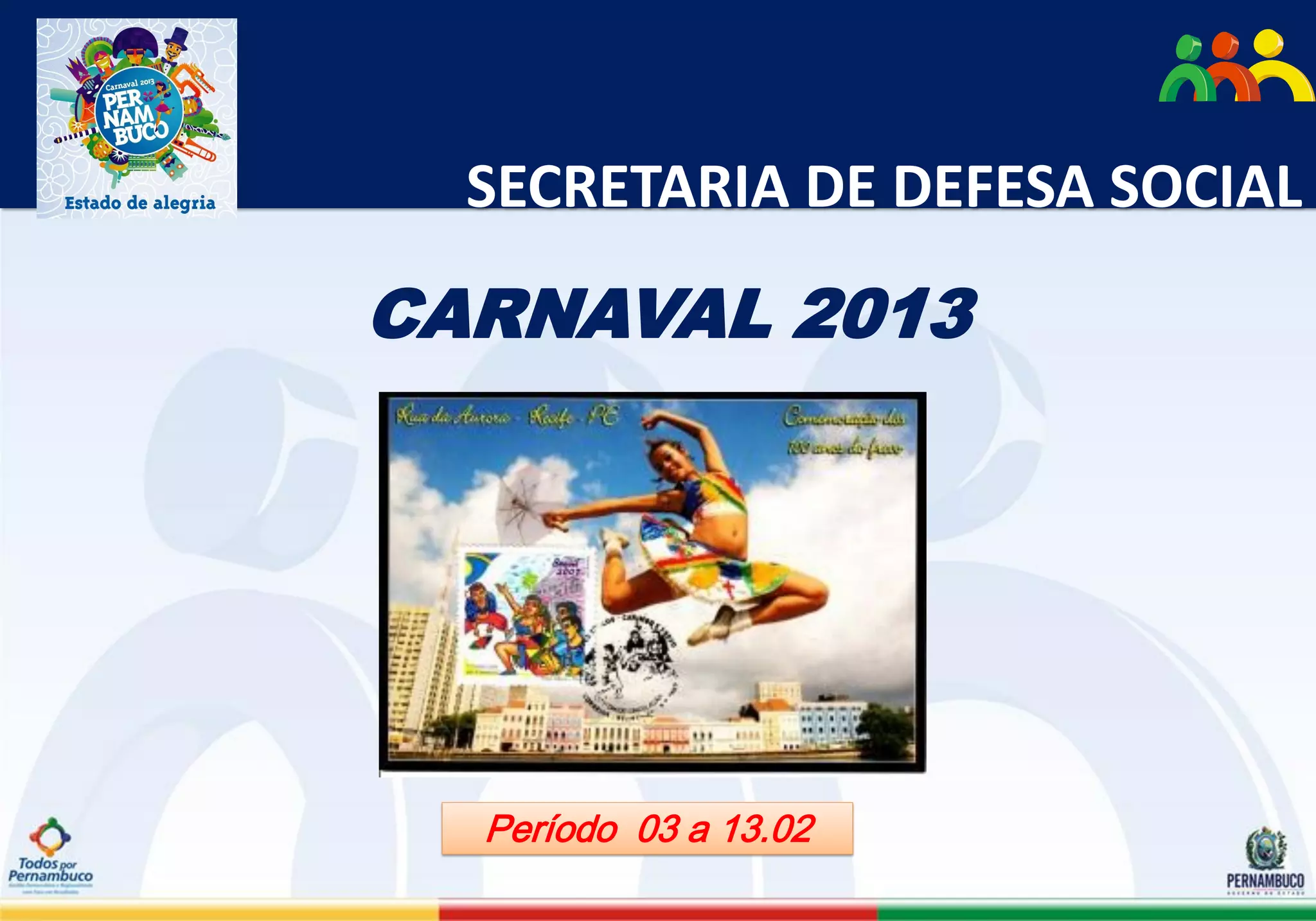 O documento resume os investimentos e efetivos da Secretaria de Defesa Social de Pernambuco para a operação de segurança do Carnaval de 2013, incluindo mais de 5 milhões de reais em gastos, 43 mil profissionais de segurança e 2,2 mil viaturas.