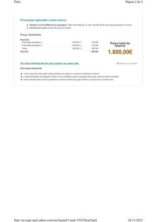 Este documento fornece um orçamento detalhado para um cruzeiro de 8 dias saindo de Veneza e visitando portos na Itália, Montenegro, Grécia e Croácia a bordo do navio MSC Armonia. O cruzeiro inclui alojamento, refeições, entretenimento e atividades a bordo para 2 passageiros em uma cabine interior pelo preço total de 1.800 euros.