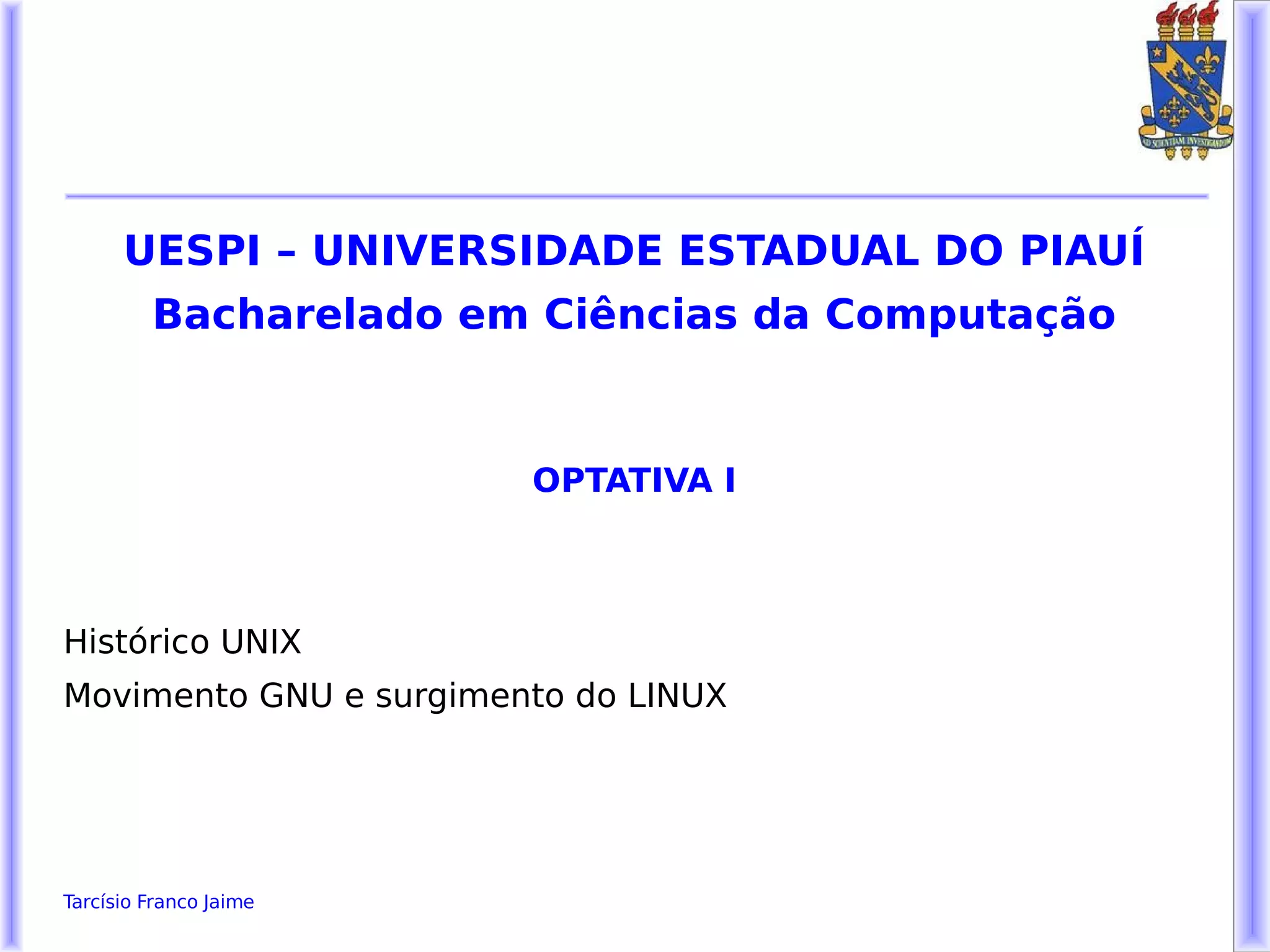 O documento discute a história do Unix, o movimento GNU e o surgimento do Linux. Apresenta o fracasso do projeto Multics que levou ao desenvolvimento do Unix, o início da Free Software Foundation e do projeto GNU, e como o kernel Linux e o sistema operacional GNU/Linux foram desenvolvidos a partir desses projetos de software livre e código aberto.