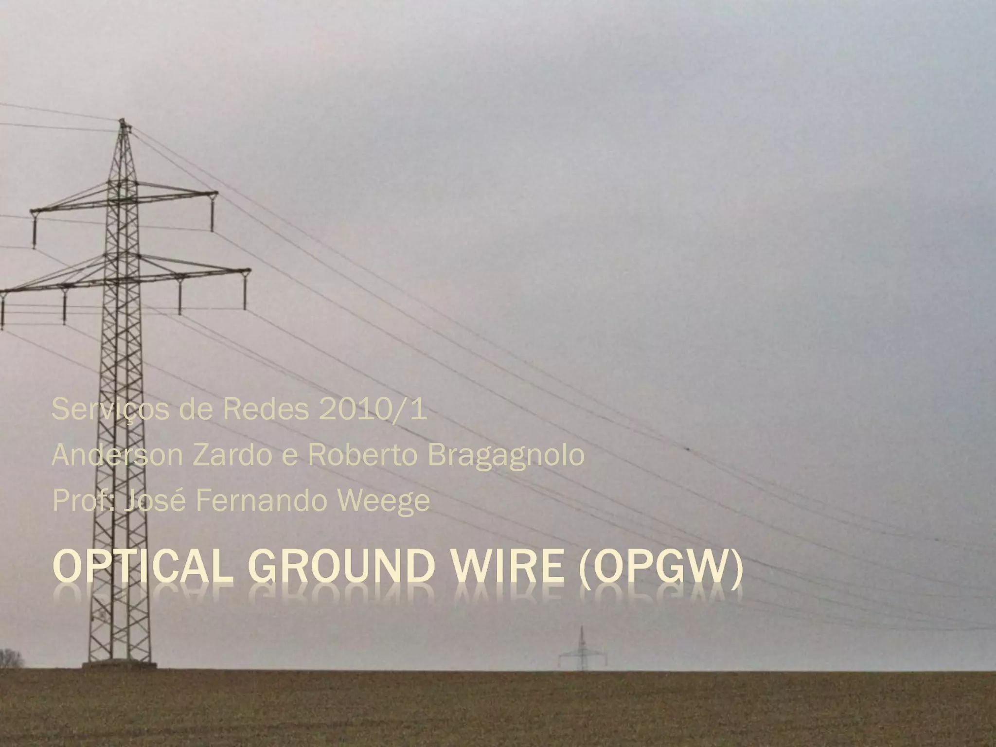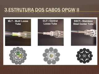 O documento descreve cabos pára-raios com fibras ópticas para linhas aéreas de transmissão de energia elétrica. Esses cabos substituem completamente os cabos de para-raios convencionais e permitem a comunicação através de fibras ópticas, além de proteger contra descargas atmosféricas. Eles possuem vantagens como menor custo de transmissão de informação, interligação de centros em menor distância e possibilidade de exploração comercial.