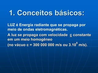 1. O documento discute conceitos básicos de óptica geométrica, incluindo a natureza da luz, fontes de luz, propagação da luz em meios transparentes, reflexão e refração. 2. Apresenta os princípios da óptica geométrica, como a propagação retilínea da luz e a independência dos raios luminosos. 3. Explica fenômenos como reflexão, refração, absorção e a formação de cores, e dispositivos como espelhos planos e esféricos.