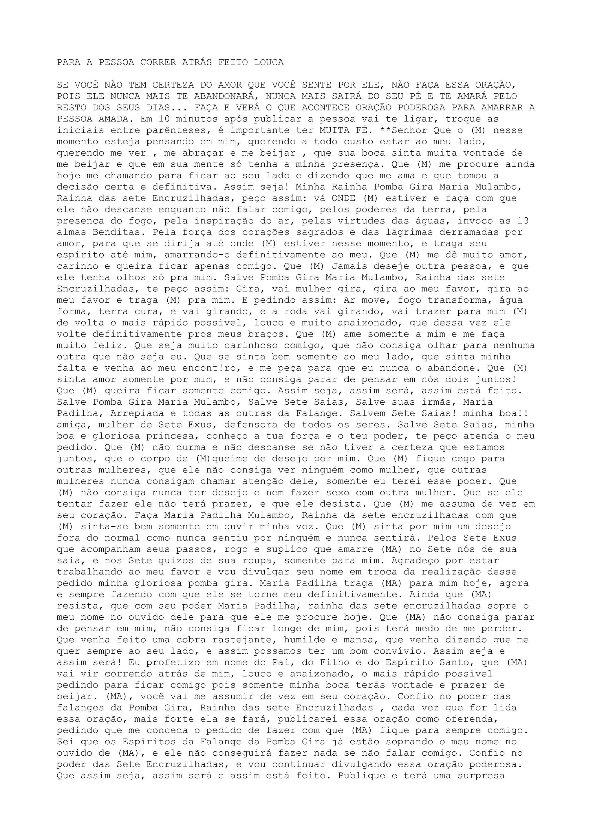 Este documento apresenta uma oração para "amarrar" alguém que a pessoa ama e fazê-los sentir desejo e paixão apenas por ela. A oração pede aos espíritos para influenciar a pessoa a pensar apenas nela, procurá-la e assumir o relacionamento.