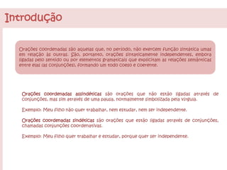 O documento discute tipos de orações coordenadas. Existem orações coordenadas assindéticas, que se ligam por pausa, e sindéticas, que se ligam por conjunções. As orações sindéticas podem ser classificadas em aditivas, adversativas, alternativas, conclusivas e explicativas dependendo da conjunção usada.