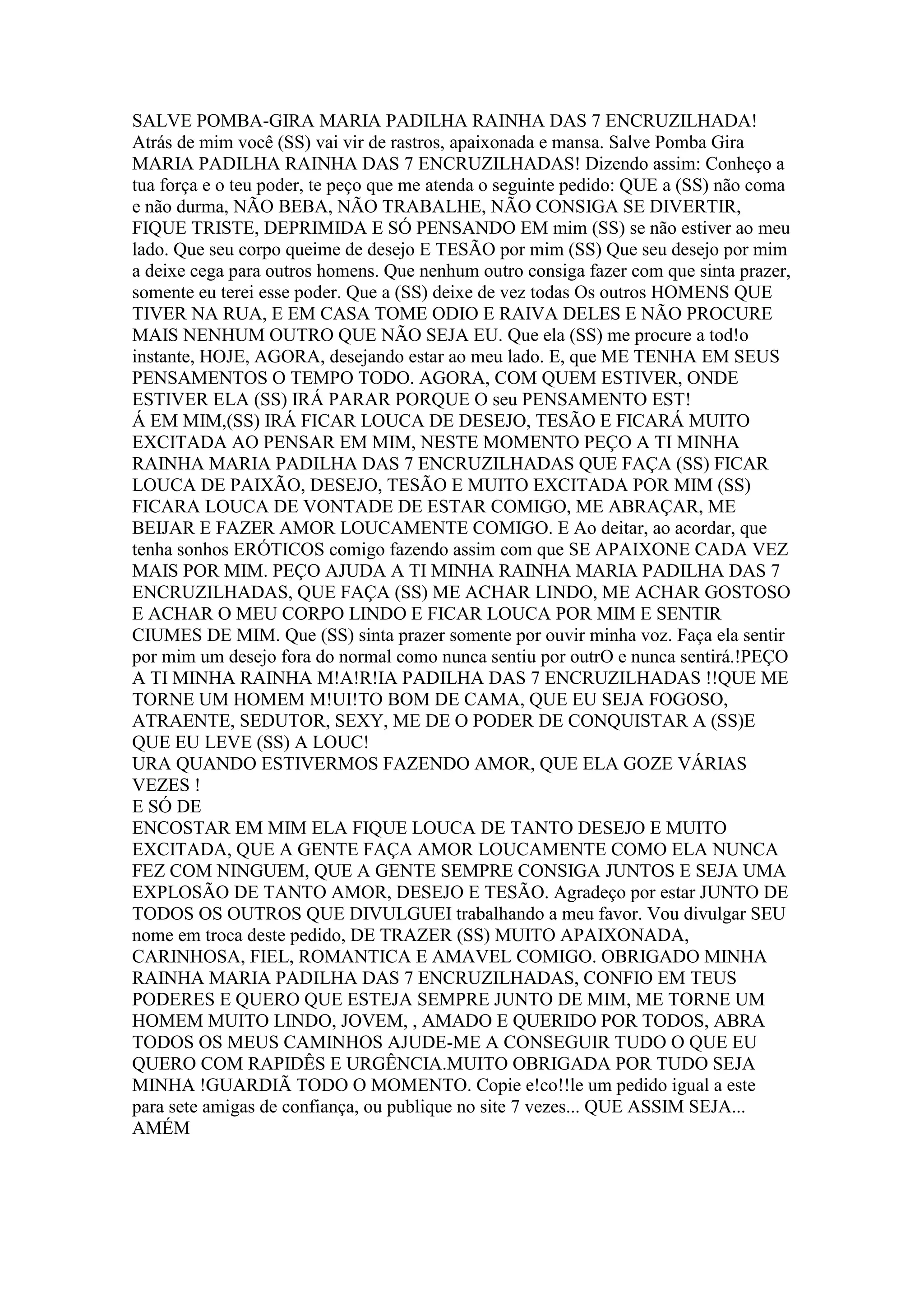 Este documento pede ajuda à entidade Maria Padilha, Rainha das 7 Encruzilhadas, para que uma pessoa específica (SS) fique apaixonada, desejosa e obcecada pelo autor. Ele pede que a pessoa não consiga se divertir ou pensar em ninguém além dele e que fique louca de paixão e tesão sempre que pensar nele.