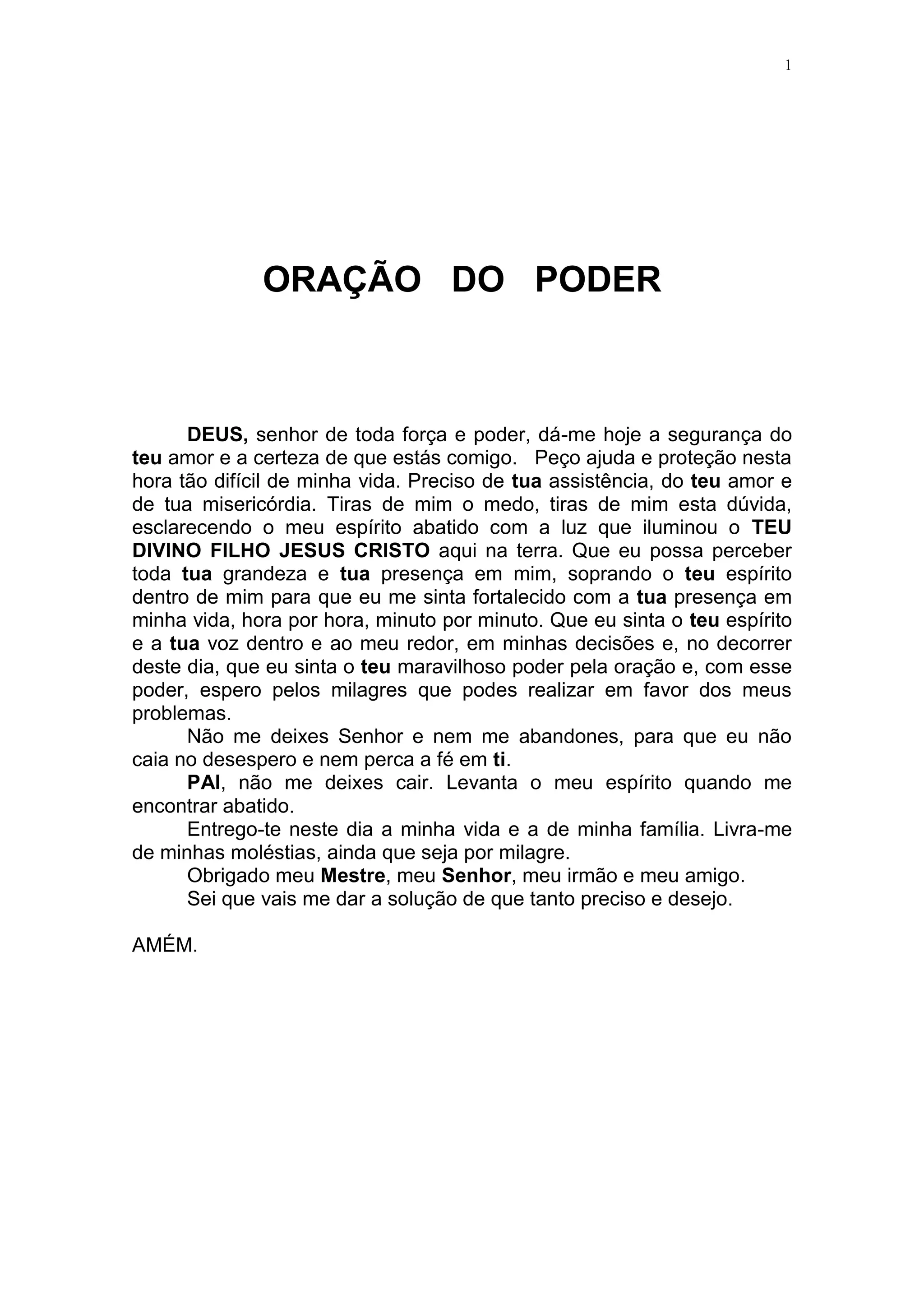 Este documento contém uma oração de fé e pedido de proteção a Deus, na qual a pessoa pede ajuda, proteção e força para superar dificuldades, pedindo que Deus tire o medo e a dúvida e ilumine seu espírito. A pessoa também pede cura para suas moléstias e solução para os problemas, expressando confiança em receber a ajuda divina.