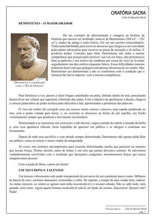 O documento oferece orientações práticas para pregadores do evangelho, enfatizando a importância da oratória e do uso de dons e talentos dados por Deus. Utilizando a figura histórica de Demóstenes, ilustra a perseverança e o desenvolvimento das habilidades de comunicação, além de ressaltar que os talentos só têm valor se utilizados para o benefício da comunidade. Finaliza abordando a responsabilidade do pregador em comunicar a mensagem de Deus de forma fiel e relevante considerando seu público.