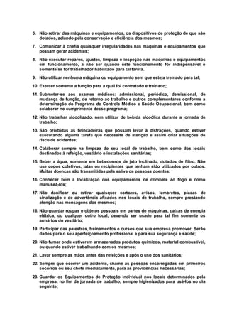 Este documento estabelece procedimentos de segurança a serem adotados por todos os empregados de uma empresa. Inclui regras sobre equipamentos de proteção individual, comissão interna de prevenção de acidentes, treinamentos obrigatórios, proibições e cuidados específicos para soldagem, uso de produtos de limpeza e agrotóxicos.