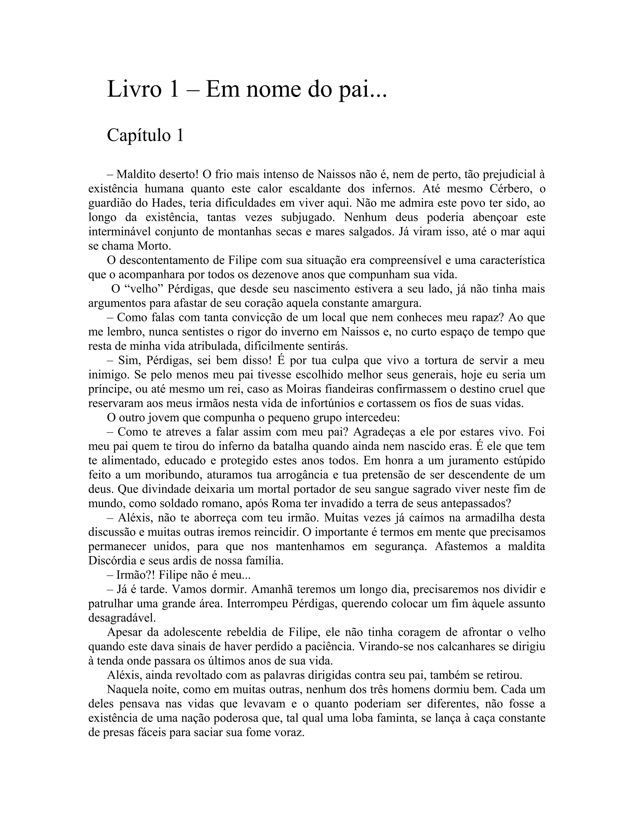 O documento apresenta a história de Pérdigas, um guerreiro ilírio que lutou contra a invasão romana de sua terra natal. Após a derrota, ele se tornou soldado romano para sustentar sua família. O texto descreve as lembranças de Pérdigas sobre a antiga prosperidade da Ilíria e a perda da liberdade com a conquista romana. Também apresenta as tensões entre Filipe, um jovem ilírio sob a tutela de Pérdigas, e os outros soldados do grupo.