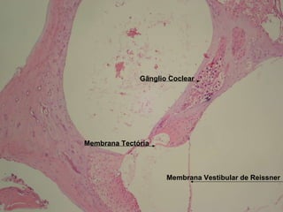 O documento lista estruturas anatômicas do ouvido interno, incluindo o gânglio coclear, gânglio vestibular, membrana vestibular de Reissner, limbo espiral e órgão de Corti, e descreve suas relações com outras estruturas como a parede lateral do conduto do caracol, estria vascular e membrana tectória.