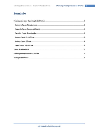 Este documento fornece orientações passo a passo para organizar oficinas sobre a Estratégia Brasileirinhas e Brasileirinhos Saudáveis (EBBS), incluindo planejamento, responsabilidades, organização, pré-oficina, oficina, pós-oficina, termo de referência, relatório e avaliação. O objetivo é apoiar as ações da EBBS e multiplicar oficinas em qualquer espaço de gestão interessado.