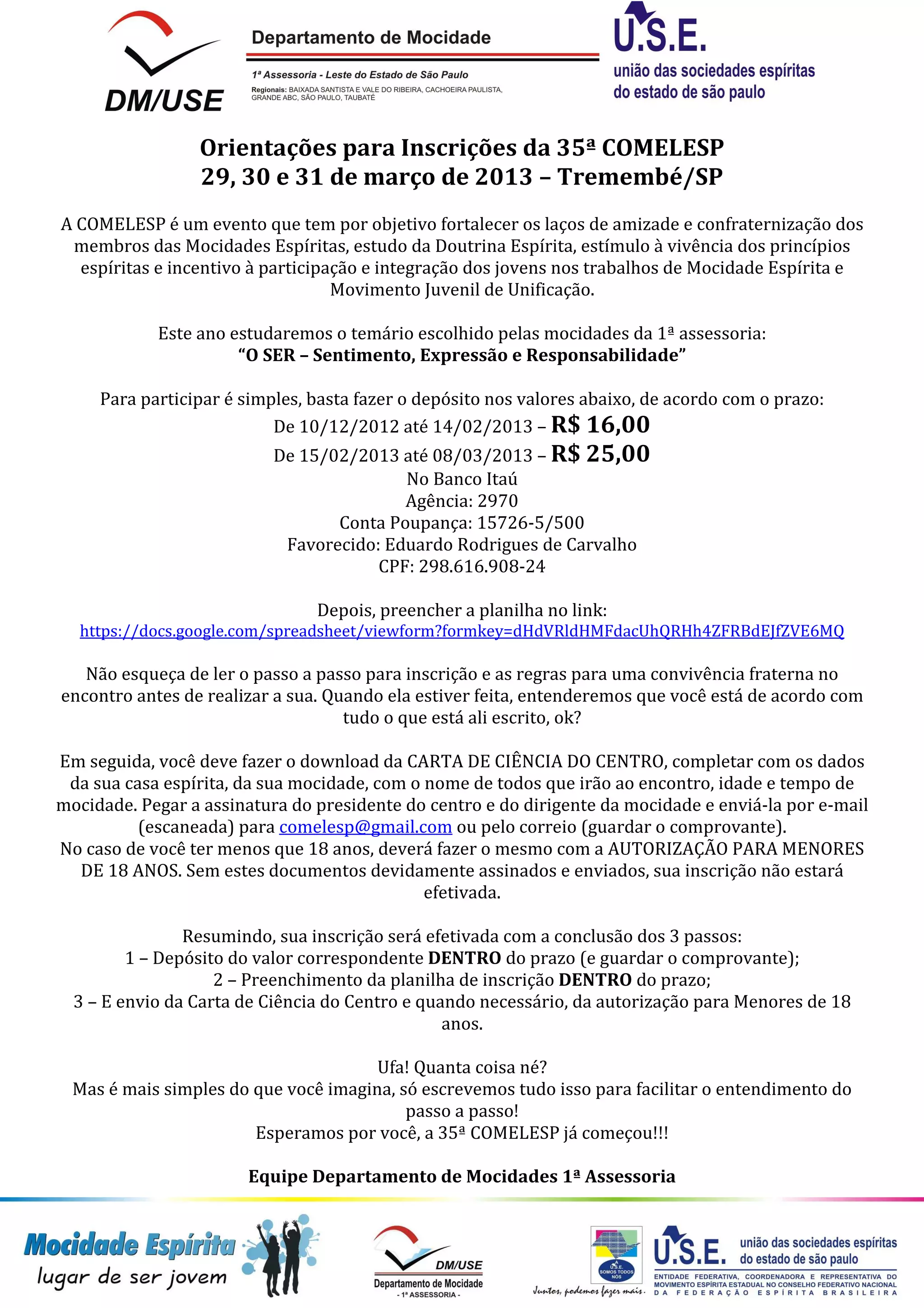 Este documento fornece orientações para a inscrição na 35a Confraternização das Mocidades Espíritas Seccionais (COMELESP) em Tremembé, SP, que ocorrerá de 29 a 31 de março de 2013. O evento tem como objetivo fortalecer os laços de amizade e estudar o tema "O SER - Sentimento, Expressão e Responsabilidade". As inscrições devem ser feitas até 8 de março, preenchendo uma planilha online e enviando cartas de autorização assinadas.
