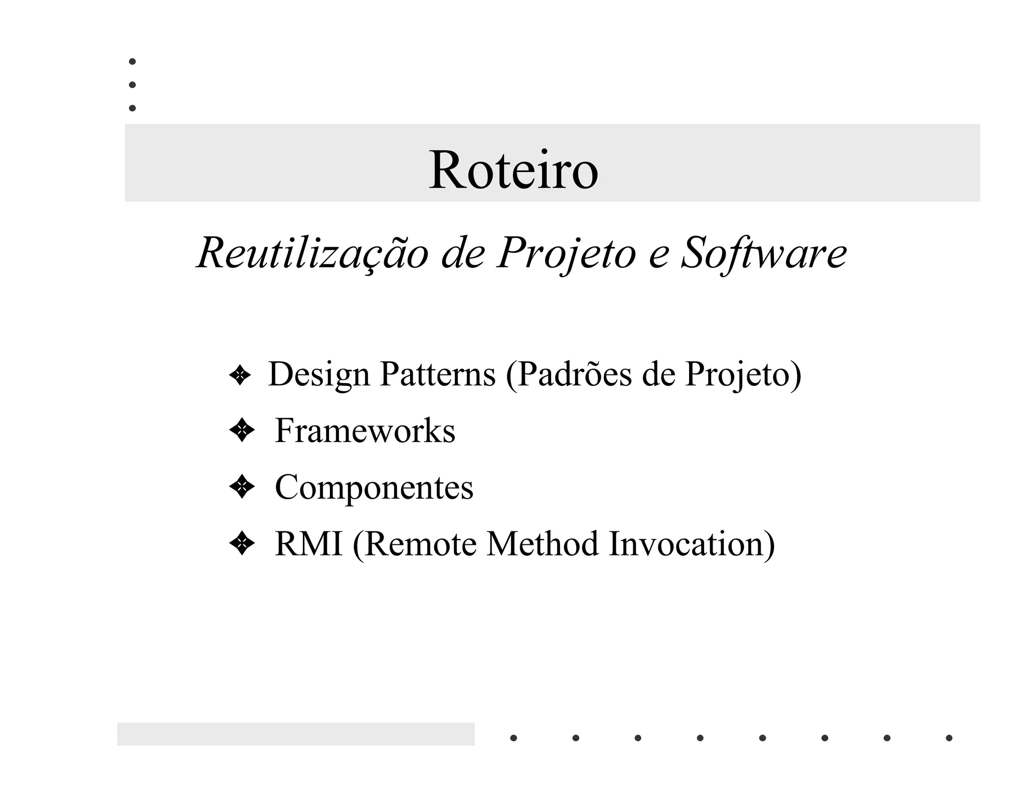 Este documento fornece uma introdução aos principais tópicos relacionados à reutilização de projetos e software em Java, incluindo padrões de projeto, frameworks, componentes e objetos distribuídos. Exemplos de padrões como Observer, State e Composite são discutidos, assim como frameworks MVC e pacotes Java.