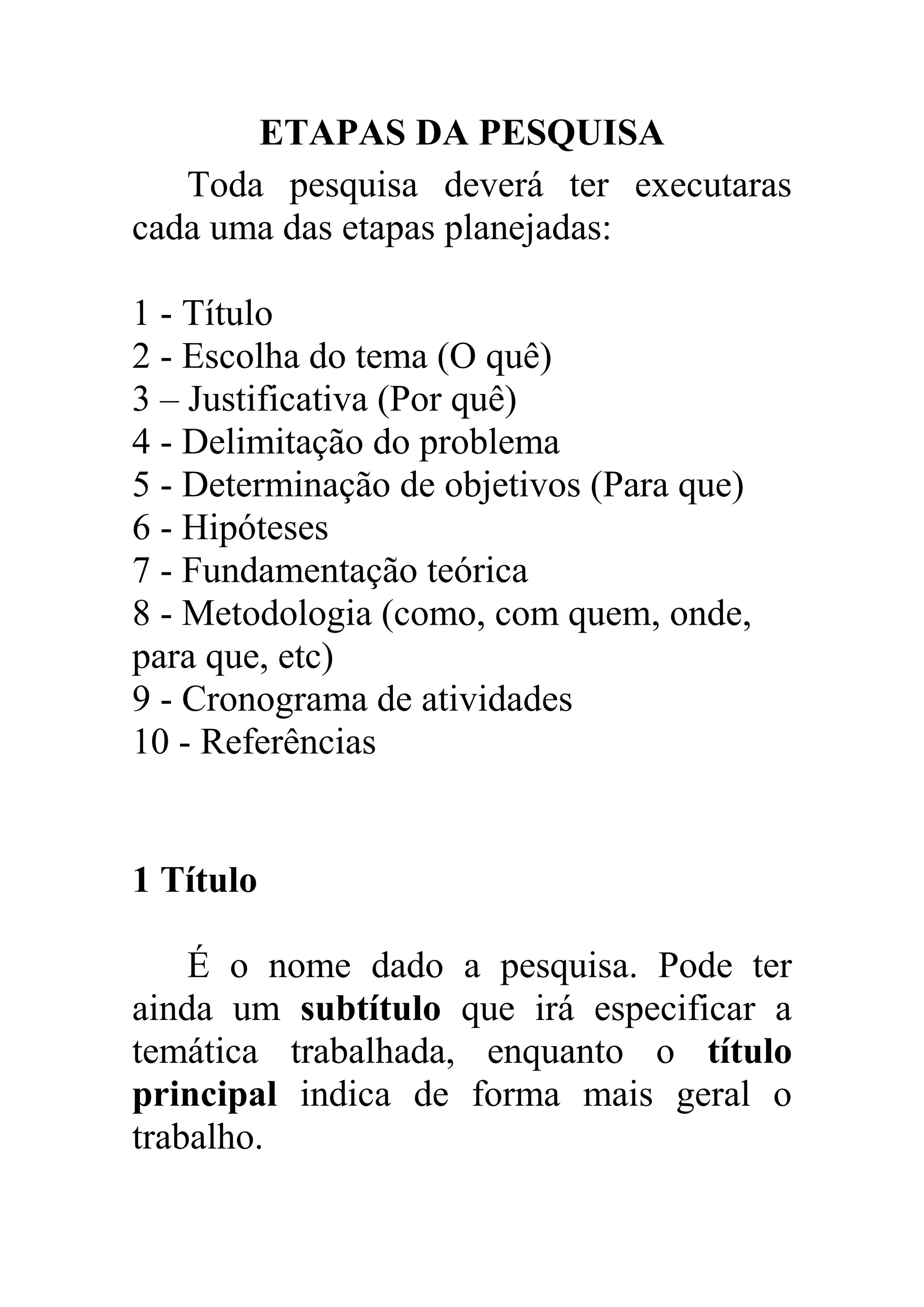 O documento descreve as 10 etapas essenciais de uma pesquisa acadêmica: 1) título, 2) escolha do tema, 3) justificativa, 4) delimitação do problema, 5) objetivos, 6) hipóteses, 7) fundamentação teórica, 8) metodologia, 9) cronograma de atividades, e 10) referências. Cada etapa é explicada em detalhe, incluindo exemplos de verbos para definir objetivos e como formular hipóteses. O documento fornece diretrizes abrangentes para planejar e estr