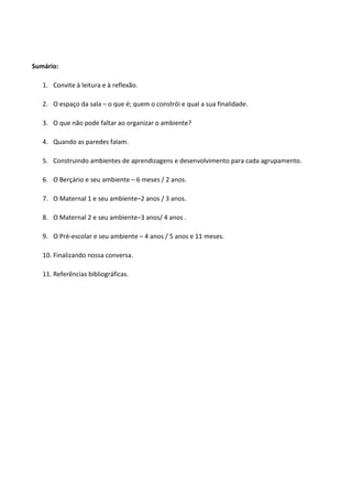 O documento discute a organização dos espaços nas instituições de educação infantil e como eles devem ser projetados para apoiar o desenvolvimento e aprendizagem das crianças. Ele fornece sugestões sobre como organizar os ambientes de acordo com as faixas etárias, incluindo a disponibilização de diferentes cantos de atividades e materiais apropriados para cada idade.