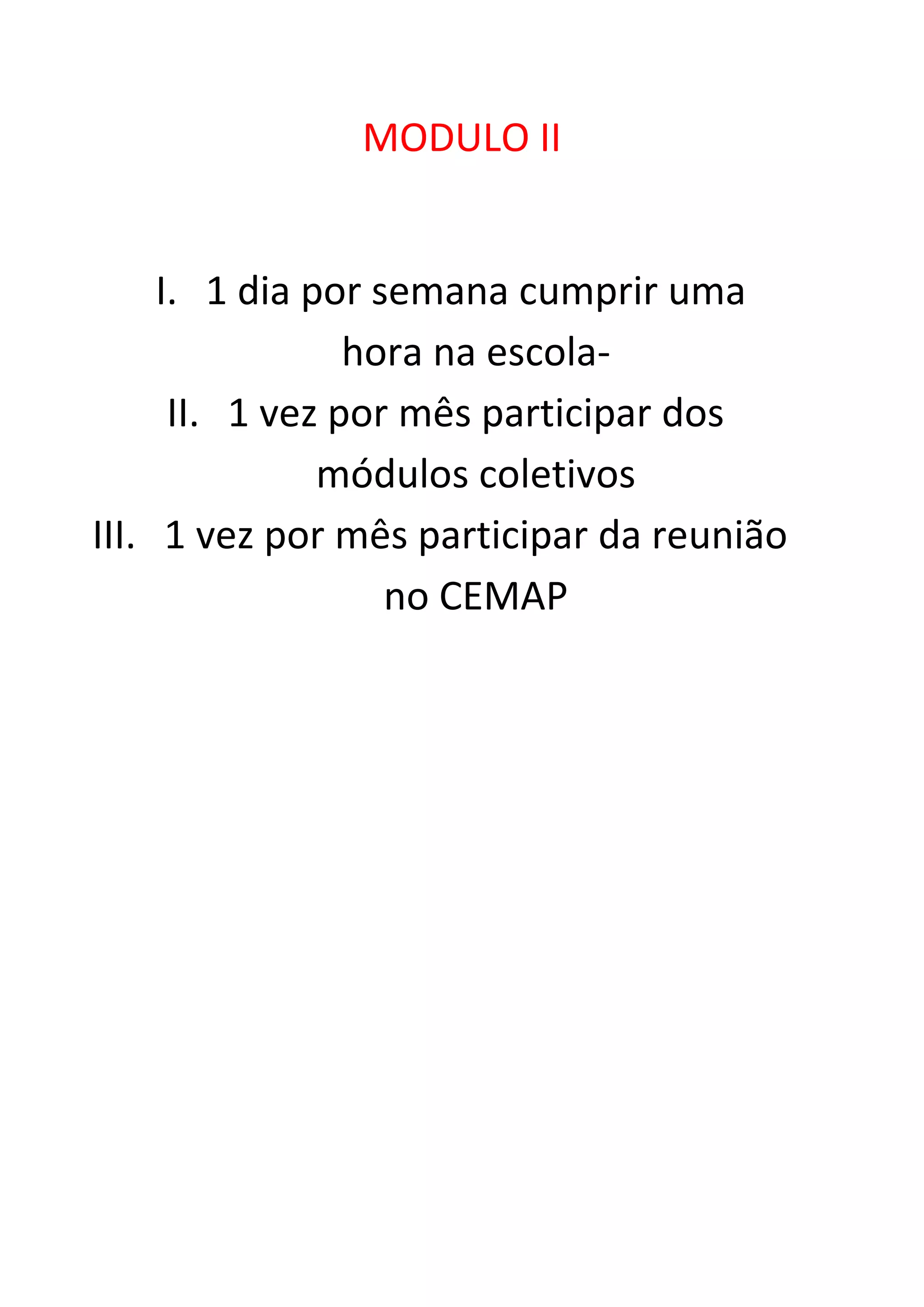 O módulo exige que os alunos cumpram 1 hora por semana na escola, participem de módulos coletivos uma vez por mês e participem de reuniões mensais no CEMAP.