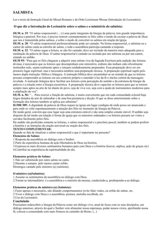 O salmo responsorial é uma parte importante da liturgia da palavra e deve ser cantado ou recitado de forma a facilitar a meditação sobre a palavra de Deus. O salmista deve conduzir a assembleia no diálogo com Deus através do salmo, assumindo os sentimentos da comunidade e vivendo o diálogo com postura e escolha de melodia adequadas. A preparação espiritual e técnica dos leitores e salmistas é essencial para que desempenhem bem seu papel.