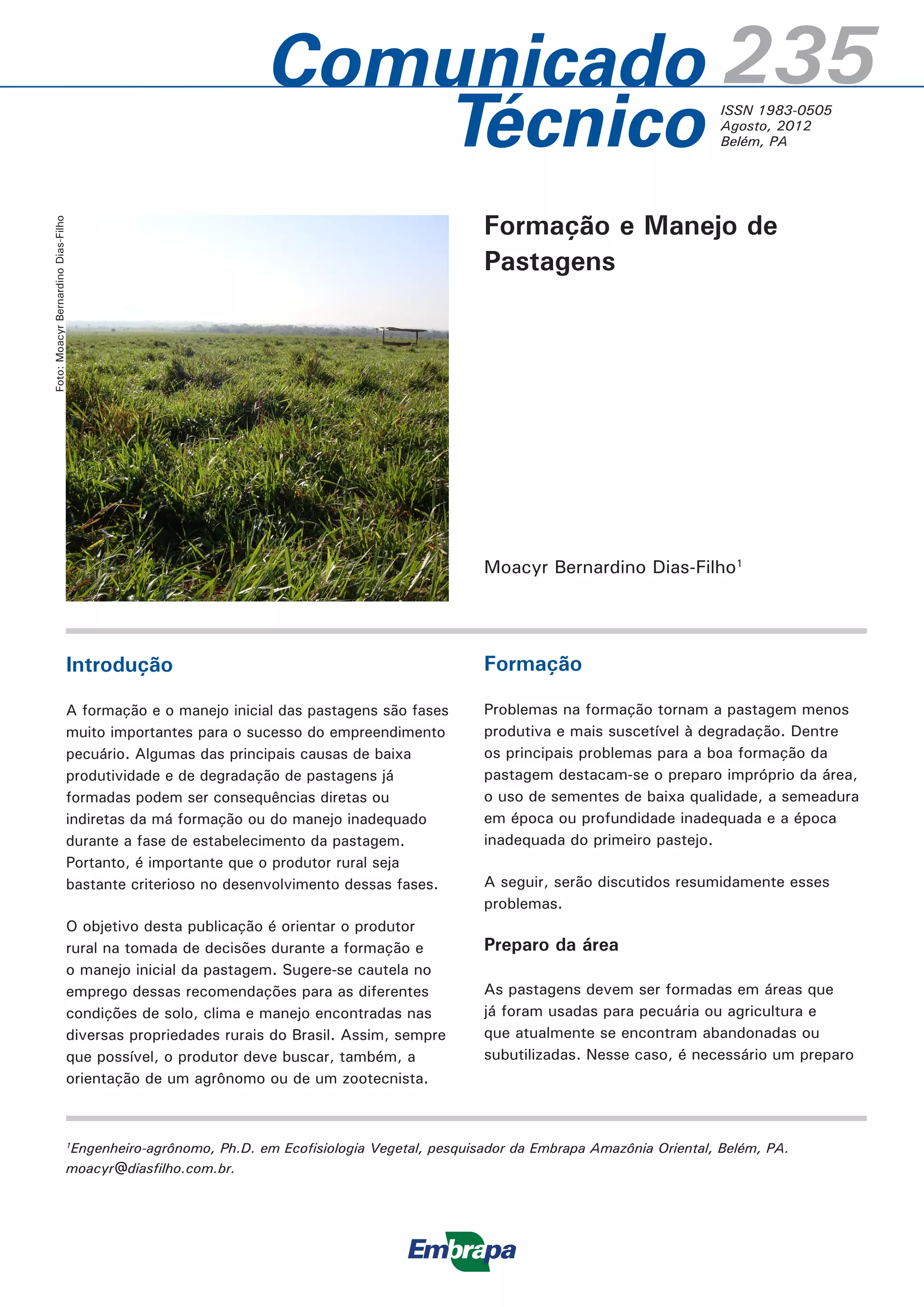 O documento fornece orientações sobre a formação e manejo inicial de pastagens, destacando a importância do preparo adequado do solo, do uso de sementes de boa qualidade e da taxa de semeadura correta. Além disso, discute a adubação necessária de acordo com a análise do solo, principalmente fósforo e potássio.