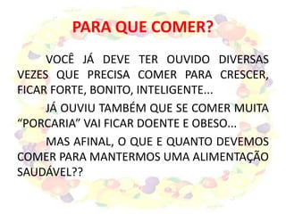 O documento apresenta a pirâmide alimentar e orienta sobre uma alimentação saudável. Ele explica que a pirâmide mostra quantas porções de cada tipo de alimento devemos comer por dia para nos mantermos saudáveis, dividindo os alimentos em energéticos, reguladores, construtores e energéticos extras. O texto enfatiza a importância de consumir frutas, verduras e diminuir doces e gorduras.