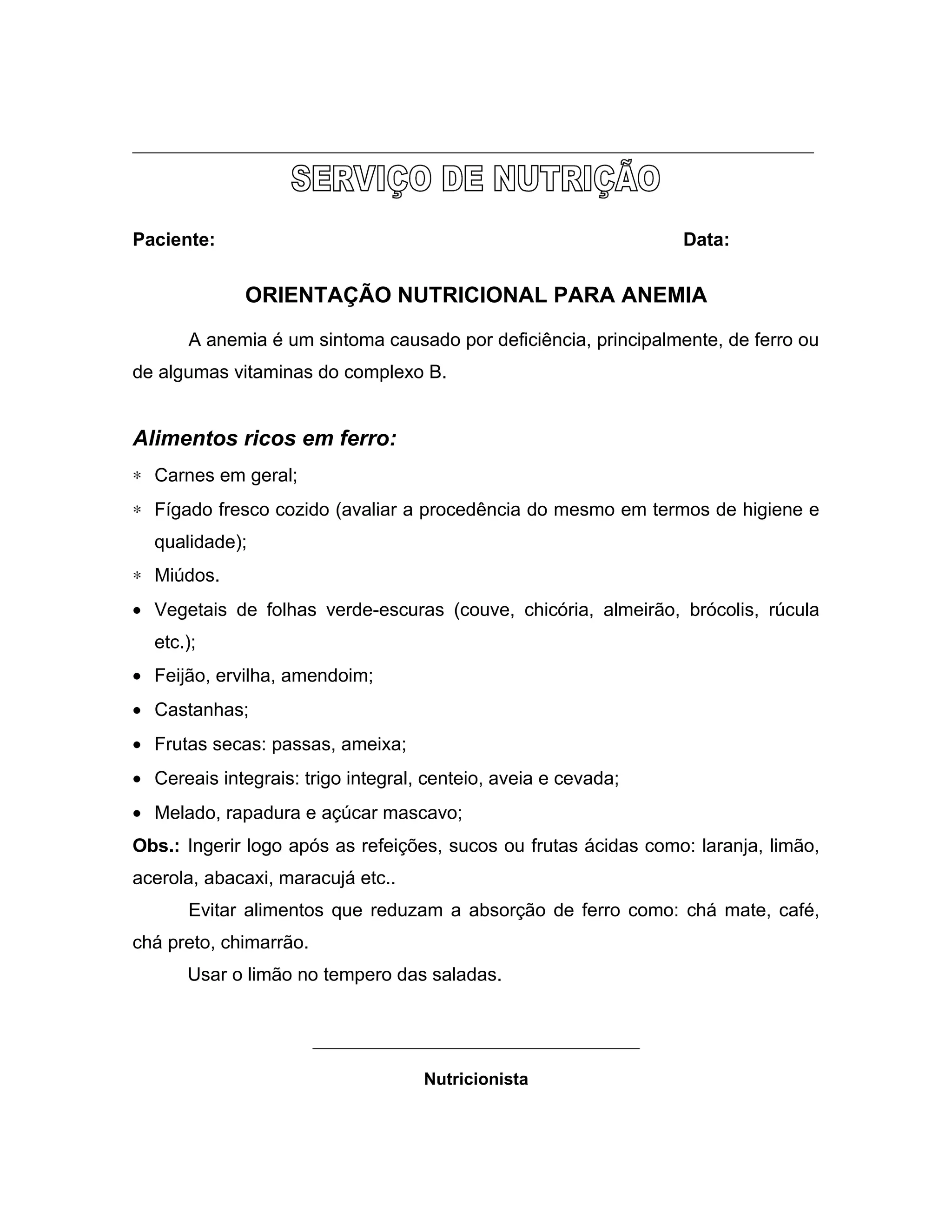 Este documento fornece orientações nutricionais para pacientes com anemia. Ele lista alimentos ricos em ferro, como carnes, fígado, vegetais de folhas verdes e castanhas, que devem ser consumidos para tratar a anemia causada por deficiência de ferro. Também recomenda evitar bebidas como chá, café e chimarrão, que reduzem a absorção de ferro, e usar limão para temperar saladas.