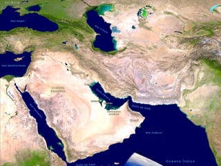 O documento discute a localização, demografia, urbanização, diversidade linguística e religiosa do Oriente Médio. Aborda as principais divisões do Islã (Sunitas, Xiitas e Kharijitas), bem como a ideologia Baath e a Primavera Árabe.