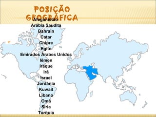 O documento discute cinco tópicos sobre o Oriente Médio: 1) a posição geográfica estratégica entre a Europa, África e Ásia, com dois importantes golfos; 2) a carência de água na região árida e os conflitos por recursos hídricos; 3) a economia baseada no petróleo, porém com desigualdades sociais; 4) a sociedade de maioria muçulmana, com conflitos religiosos e de identidade; 5) os permanentes conflitos territoriais entre Israel e