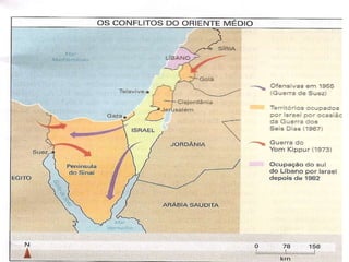O documento resume a história do conflito Israel-Palestina desde a diáspora judaica no século 1 d.C. até os líderes atuais. Ele descreve os principais eventos como a criação do Estado de Israel em 1948, as guerras árabe-israelenses subsequentes, os acordos de paz de Camp David e Oslo, e o crescimento do terrorismo com grupos como o Hezbollah e o Hamas. Também menciona os líderes atuais de Israel e da Autoridade Palestina.