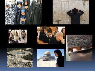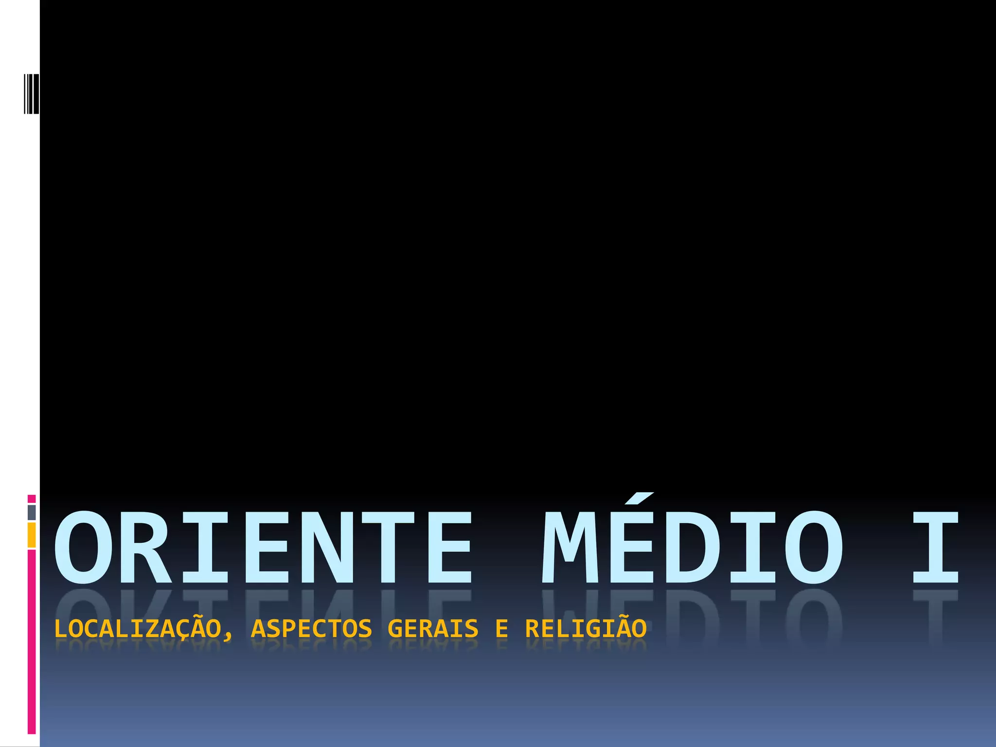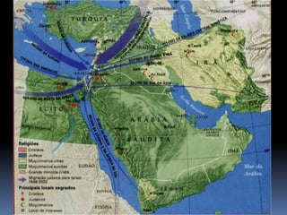 O documento descreve a localização, aspectos gerais e religião do Oriente Médio. A região está localizada na Ásia Ocidental e é composta por 15 países, com clima quente e árido. A economia é baseada no petróleo e agricultura, e as principais religiões são o Islã, Cristianismo e Judaísmo, com berço em locais sagrados como a Caaba, Muro das Lamentações e Domo da Rocha.