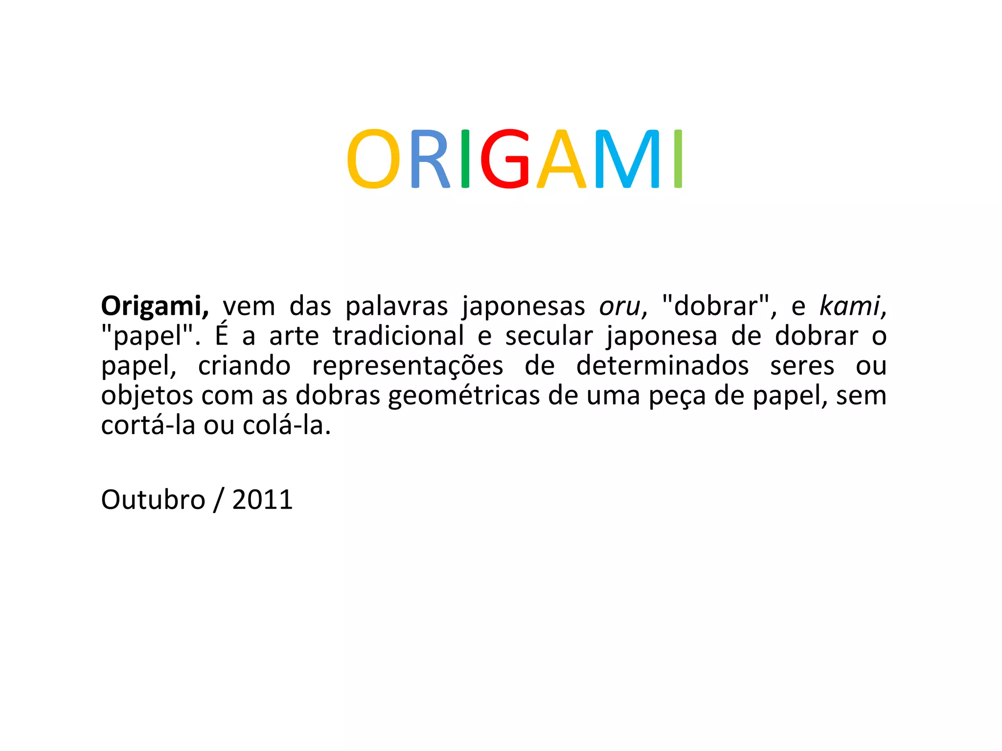 Origami é a arte japonesa de dobrar papel para criar representações de objetos sem cortar ou colar. O documento descreve origami, incluindo sua definição e origem, e como o autor pesquisou origami online e em um livro para criar um modelo de cisne de papel.