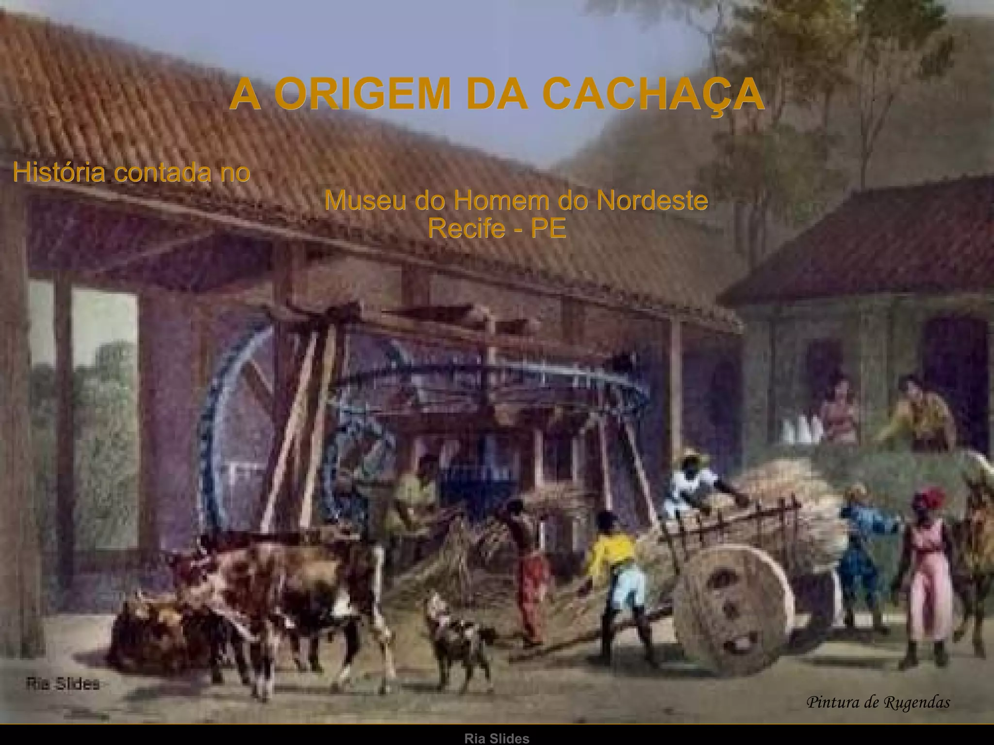 A história da origem da cachaça começou com escravos que pararam de mexer o melado da cana-de-açúcar, fazendo com que fermentasse e se transformasse em álcool. Eles misturaram o melado fermentado com o novo e o álcool evaporou, pingando no teto - a primeira cachaça. Os escravos notaram que a pinga os alegrava e os fazia dançar. Com o tempo, a fabricação da cachaça foi aprimorada e passou a ser apreciada por toda a população.