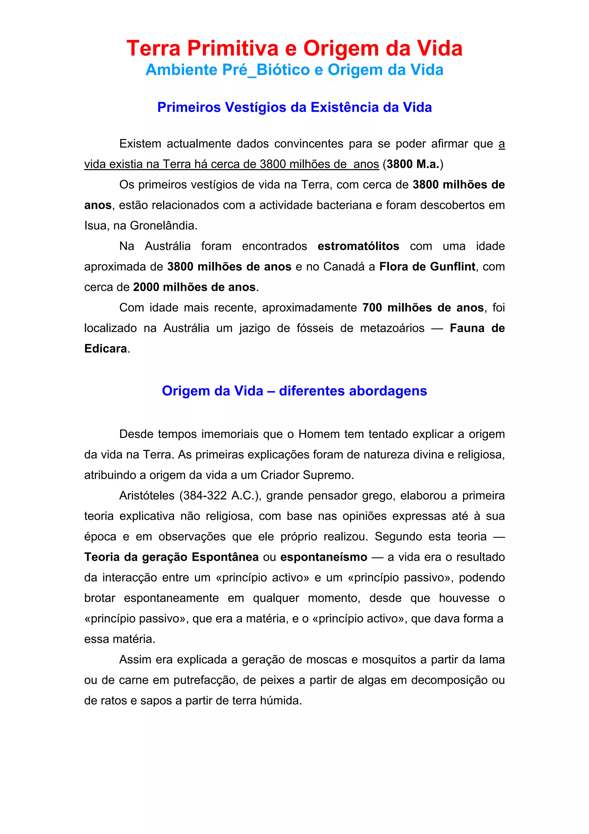 1) O documento discute as diferentes hipóteses sobre a origem da vida na Terra primitiva, incluindo a hipótese heterotrófica de Oparin-Haldane.