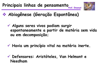 O documento discute as principais teorias sobre a origem da vida, incluindo abiogênese, biogênese, criacionismo, panspermia e evolução química gradual. Também aborda as condições necessárias para o surgimento da vida, como atmosfera, mares e continentes, e as etapas evolutivas desde moléculas orgânicas simples até as primeiras células.