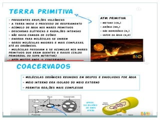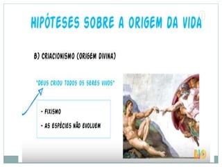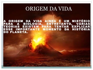 1) A origem da vida na Terra ainda é um mistério para a biologia. 2) Existem várias teorias para tentar explicar esse momento importante da história do planeta, como a evolução química e a hipótese autotrófica. 3) A abiogênese foi descartada em favor da biogênese, mas como a vida surgiu inicialmente permanece sem uma explicação definitiva.