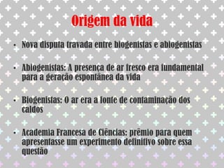 2) Louis Pasteur realizou experimentos usando frascos com pescoço de cisne que derrubaram definitivamente a hipótese da abiogênese ao mostrar que a vida só pode surgir de outra vida.