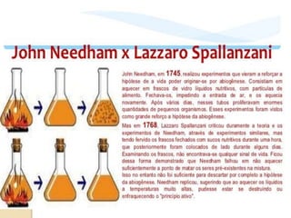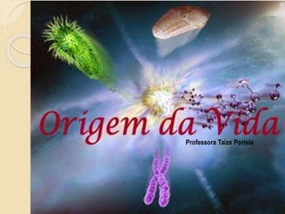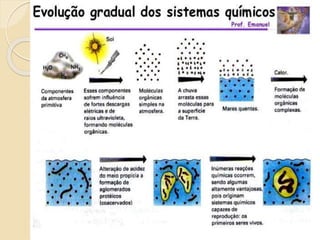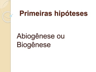 O documento discute as primeiras hipóteses sobre a origem da vida, incluindo abiogênese e biogênese. Apresenta experimentos de Redi e Pasteur que refutaram a abiogênese e apoiaram a biogênese. Também descreve a teoria da evolução química de Oparin e Haldane para a origem do primeiro ser vivo e o experimento de Miller para validar essa teoria.