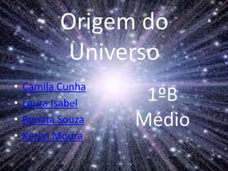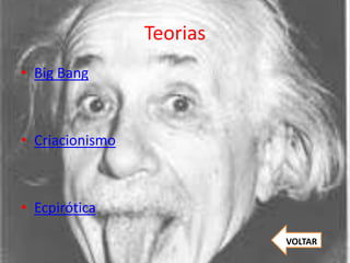 O documento discute várias teorias sobre a origem do universo, incluindo o Big Bang, o criacionismo e a teoria ecpirótica. Também aborda mitos de diferentes culturas sobre a criação, incluindo os egípcios, sérvios e chineses. Finalmente, fornece detalhes sobre a origem do Sistema Solar e dos corpos celestes.