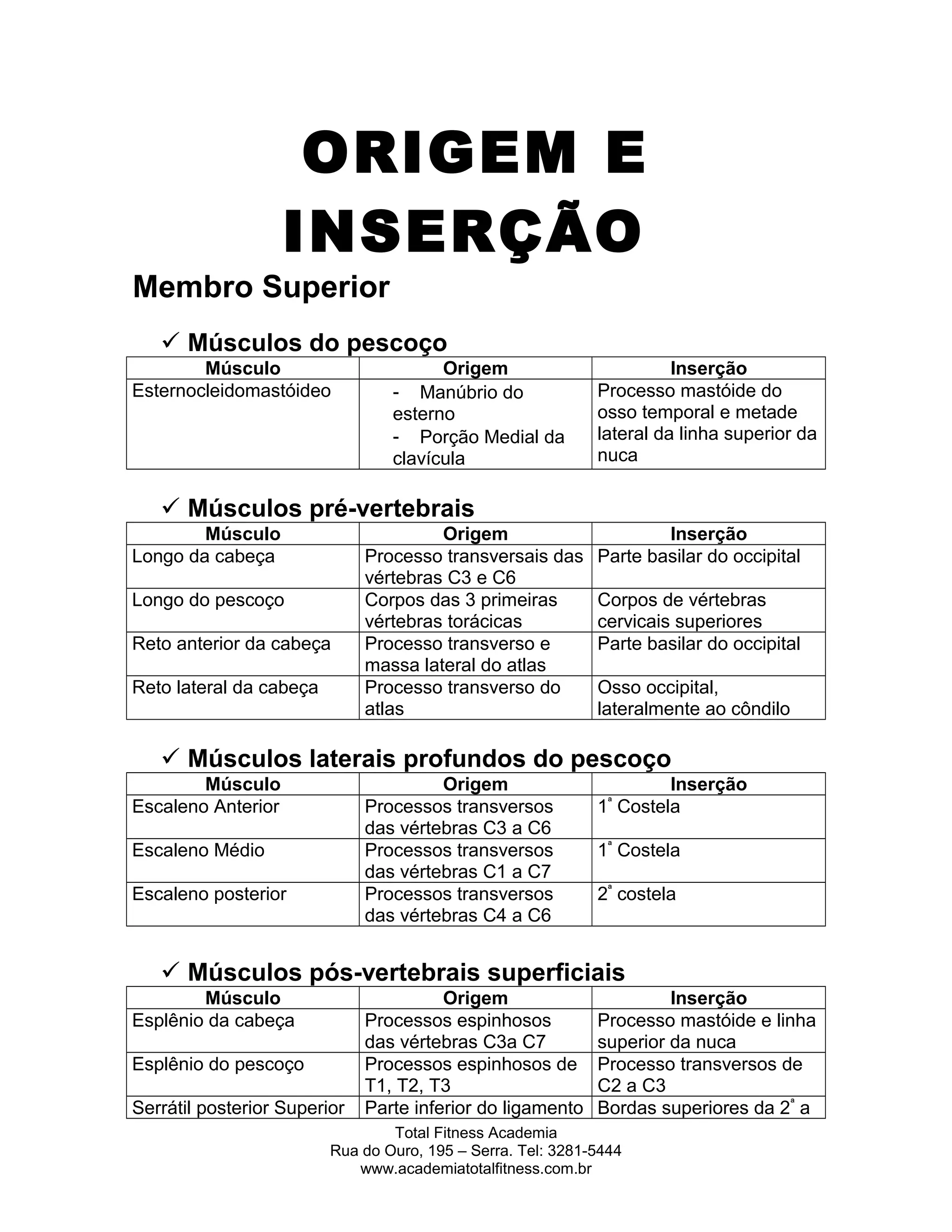 O documento lista os principais músculos do corpo humano, descrevendo sua origem e inserção. É dividido em seções sobre os músculos da cabeça e pescoço, tórax, paredes abdominal e posterior, região peitoral, dorso, ombro, braço, antebraço e mão. Fornece detalhes anatômicos fundamentais sobre cada grupo muscular e seus componentes.