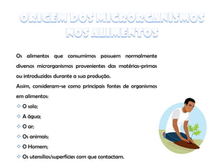 O documento descreve as principais fontes de microrganismos nos alimentos, incluindo solo, água, ar, animais e seres humanos. Discutem-se os riscos de contaminação dos alimentos através destas fontes e a importância da higiene para prevenir a propagação de microrganismos patogénicos.