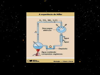O documento discute a origem da vida na Terra. Apresenta três principais teorias: 1) Criação divina, 2) Origem extraterrestre através de panspermia, 3) Origem por evolução química a partir de moléculas orgânicas na atmosfera primitiva da Terra, como proposta por Oparin e Haldane. Experiências de Miller e Fox apoiaram esta última teoria, mostrando a formação de aminoácidos e proteínas em condições simuladas da Terra antiga.