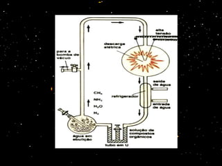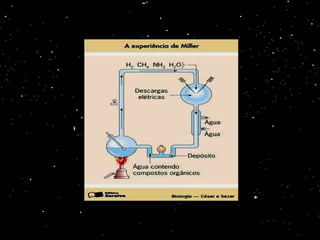 O documento discute a origem da vida na Terra e as principais teorias sobre o surgimento dos primeiros seres vivos. A teoria da abiogênese defendia que a vida surgiu espontaneamente da matéria inanimada, enquanto a biogênese defendia que a vida só pode surgir de outra vida. Experimentos de Pasteur e outros cientistas refutaram a abiogênese e apoiaram a teoria de que a vida surgiu a partir de reações químicas complexas na atmosfera primitiva da Terra, conforme pro