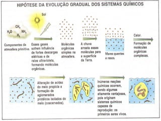1. O documento discute as principais teorias sobre a origem da vida e do sistema solar, incluindo abiogênese, biogênese e evolução química.