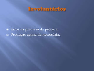 Existem dois tipos de stocks: involuntários, causados por erros de previsão, e deliberados, usados para nivelar procura, compensar irregularidades na produção, ter segurança contra avarias, e produzir em lotes grandes. Os stocks objetivam minimizar variações na procura, desacoplar produção e vendas, permitir compras em quantidade para obter descontos, e prevenir falta de produtos. Contudo, stocks excessivos tornam-se inúteis e onerosos para a empresa.