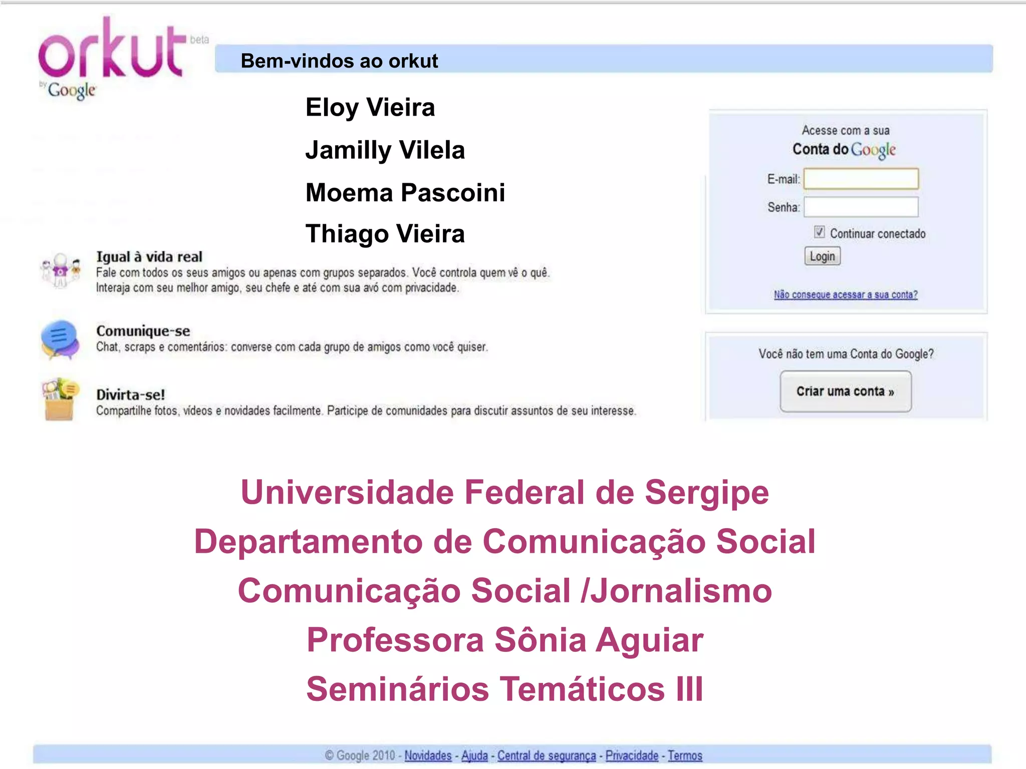 Este documento discute o Orkut, uma rede social criada em 2004. Ele descreve como o Orkut se tornou popular no Brasil, atraindo 36 milhões de visitantes únicos em 2010, e como a interface foi projetada para facilitar conexões entre usuários. Também examina como as redes sociais podem ser usadas para comunicação, marketing, educação e compartilhamento de informações.