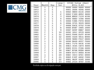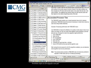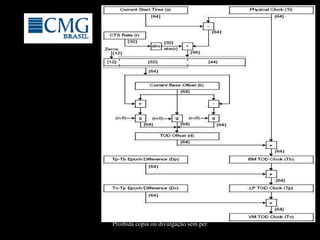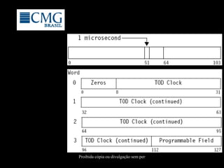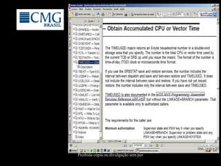 O documento discute como medir o tempo e a performance em sistemas mainframe. Em três pontos, ele explica como definir unidades de tempo, como implementar medições de tempo usando timers internos e relógios, e como realizar medições de desempenho usando a macro TIMEUSED para fornecer resultados numéricos e melhorar algoritmos e planejamento.
