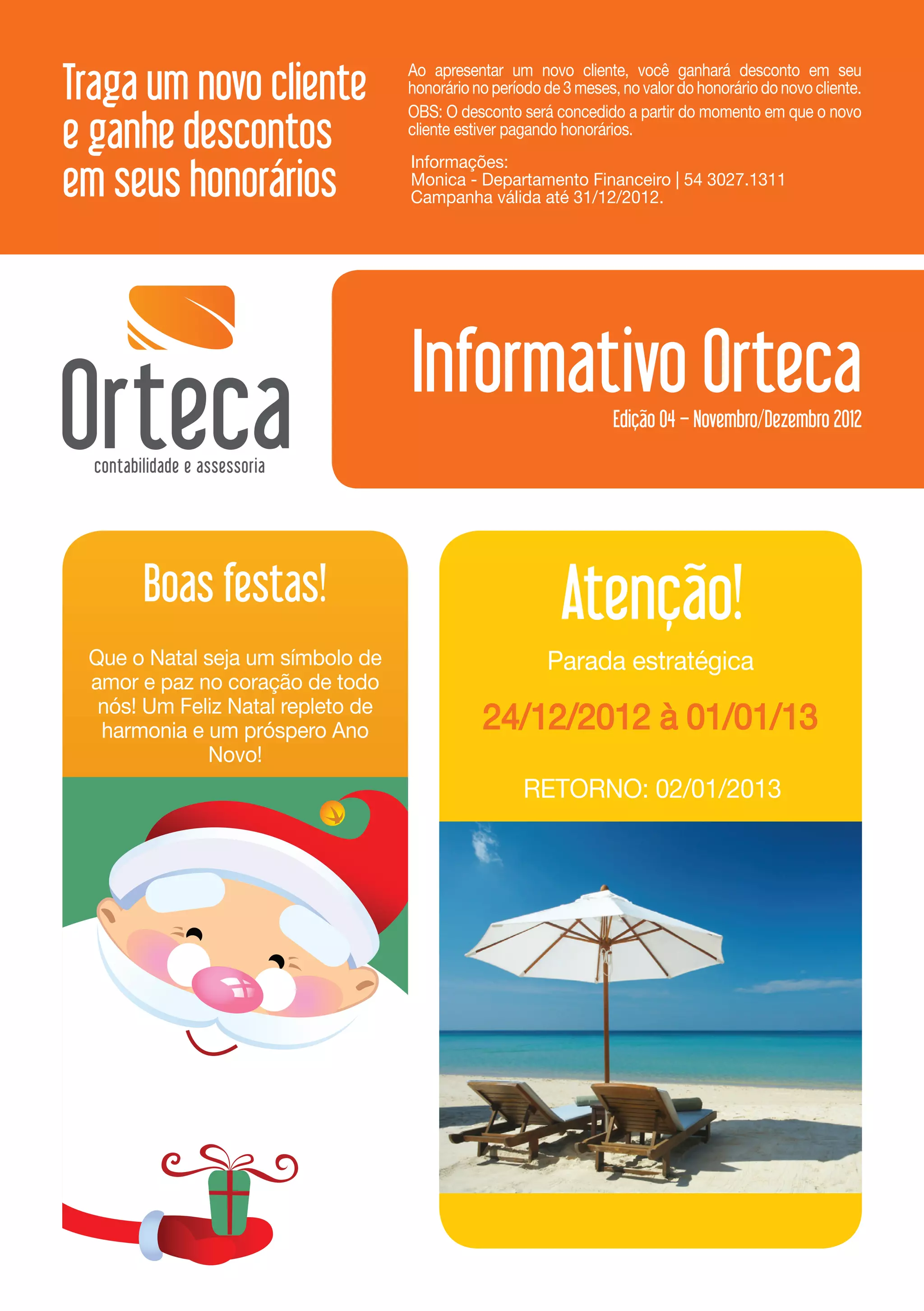 Traga um novo cliente e ganhe descontos em seus honorários. Ao apresentar um novo cliente, o cliente receberá desconto no valor equivalente ao honorário do novo cliente por 3 meses. O desconto será concedido quando o novo cliente começar a pagar honorários. Informações sobre a campanha podem ser obtidas com Monica no departamento financeiro até 31/12/2012.