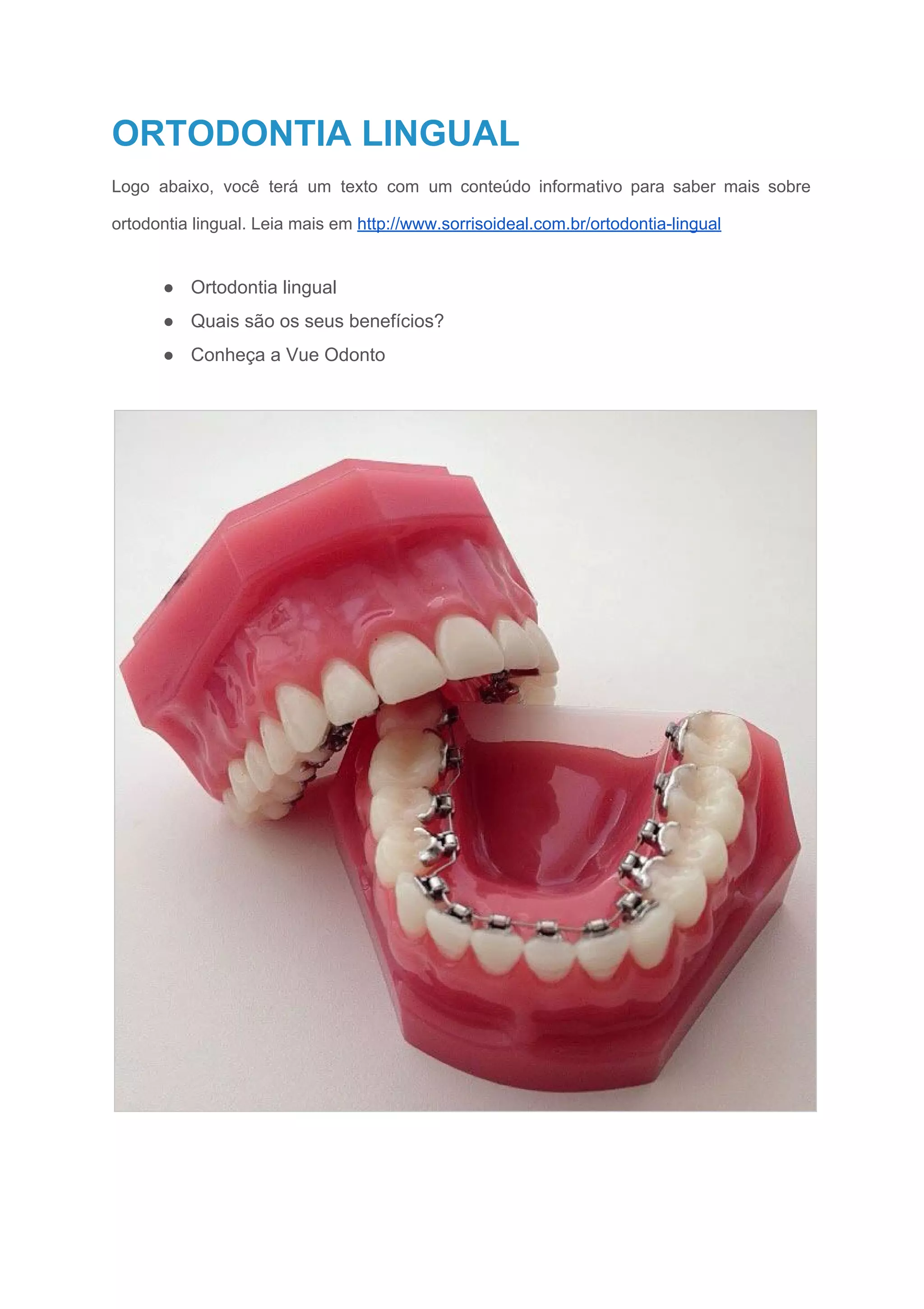 Este documento fornece informações sobre ortodontia lingual, incluindo seus benefícios como estética, melhoria da comunicação e mastigação correta, já que os braquetes são colocados internamente. Ele também menciona a clínica odontológica Vue Odonto, que oferece uma variedade de tratamentos, incluindo ortodontia lingual.
