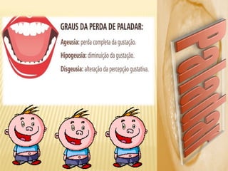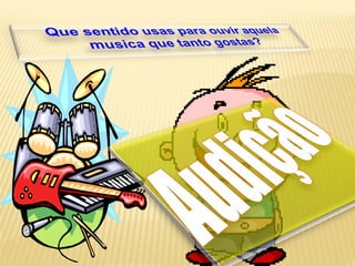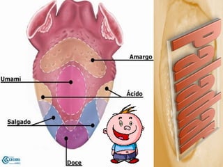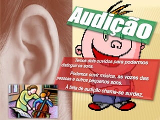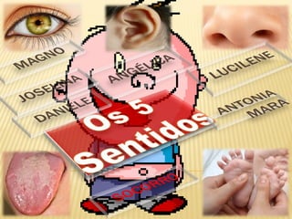 Este documento descreve os cinco sentidos humanos: visão, paladar, olfato, audição e tato. A visão nos permite ver cores e objetos, o paladar identificar sabores, o olfato sentir cheiros, a audição ouvir sons e o tato sentir texturas.