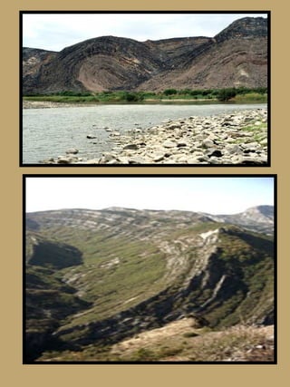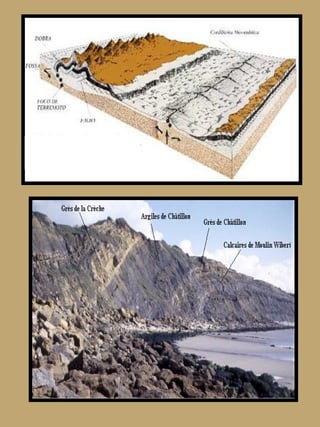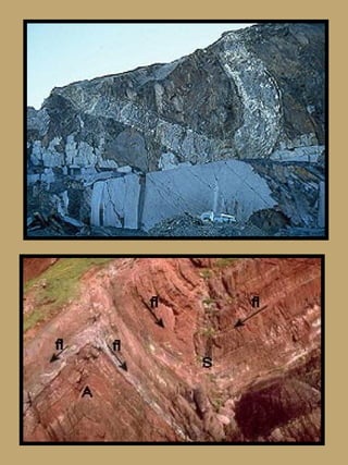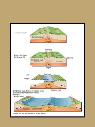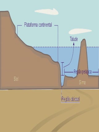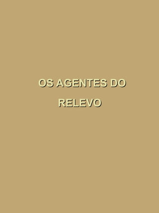 O documento descreve os principais agentes que atuam na formação do relevo terrestre, tanto internos (vulcanismo, tectonismo) quanto externos (intemperismo, ação humana). Explica como esses processos modelam as formas da crosta através do tempo, resultando em relevos diversos como montanhas, planaltos e planícies. Também aborda como a estrutura geológica e o clima influenciam na elaboração das formas do relevo.