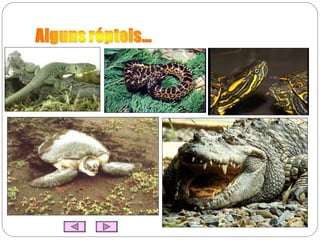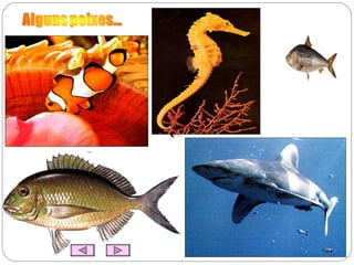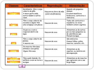 O documento descreve as principais características de diferentes classes de animais, incluindo mamíferos, aves, peixes, répteis, anfíbios e insetos. Ele também discute como esses animais se adaptaram a seus habitats e como podem ser classificados com base em semelhanças.